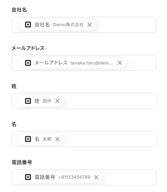 これらの値は、以降のアクションで変数(フローが稼働する度に更新される値)として使用できるようになります。つまり、HubSpotに自動登録可能なデータです。