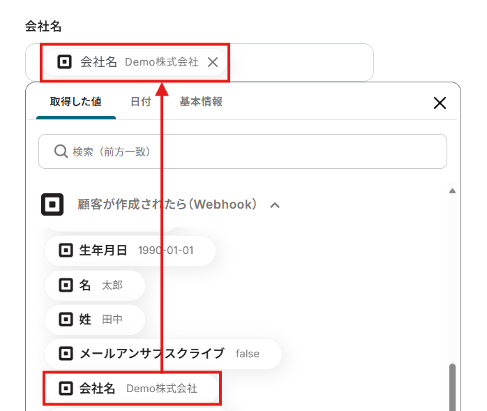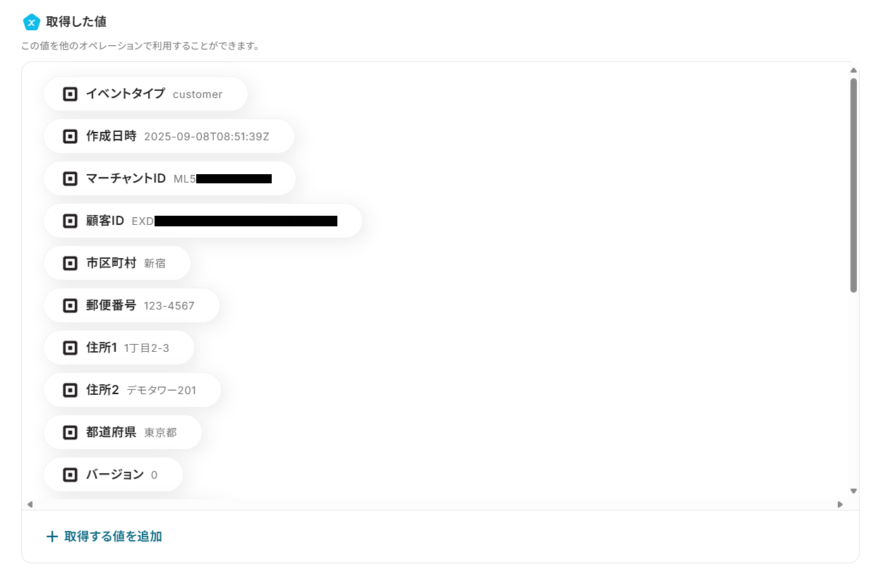 - テストに成功すると、Squareで作成した顧客の各情報が「取得した値」に追加されます。