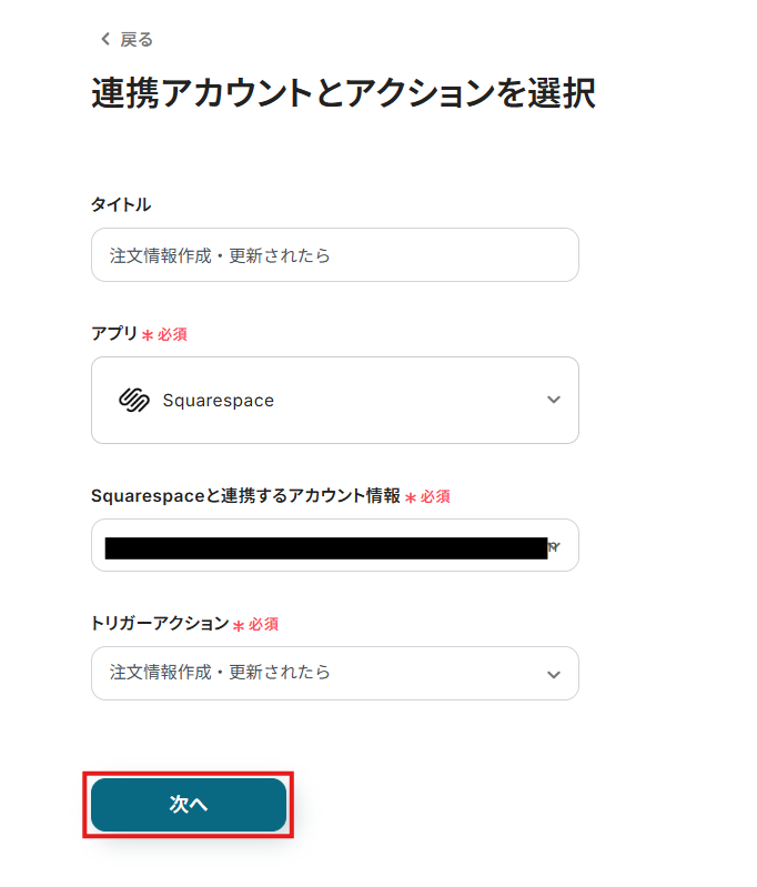 連携するアカウント情報には、ステップ1で連携したアカウント情報が反映されています。トリガーアクションはそのままにして、「次へ」をクリックしてください。