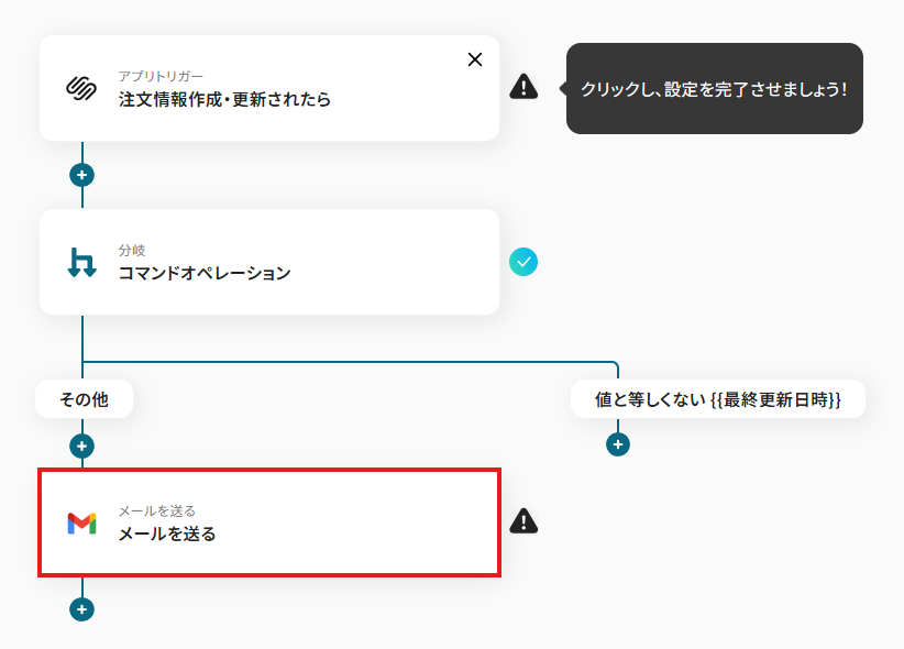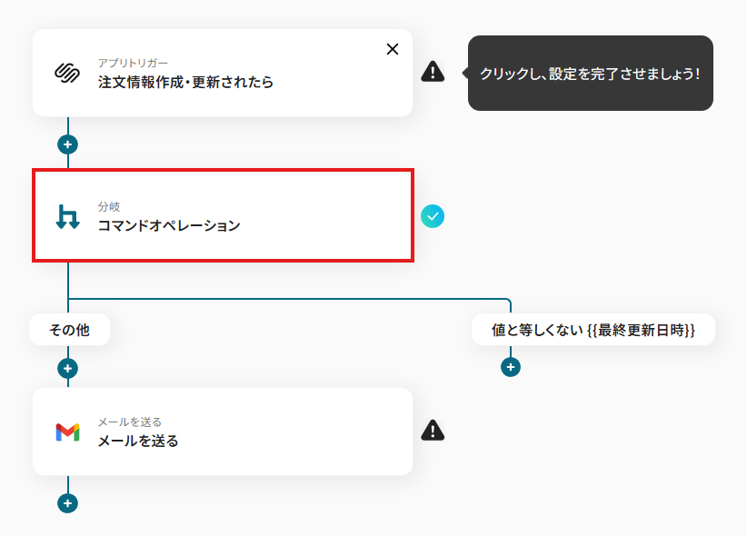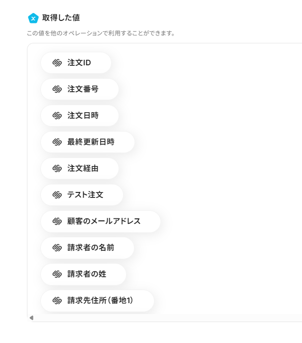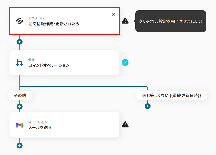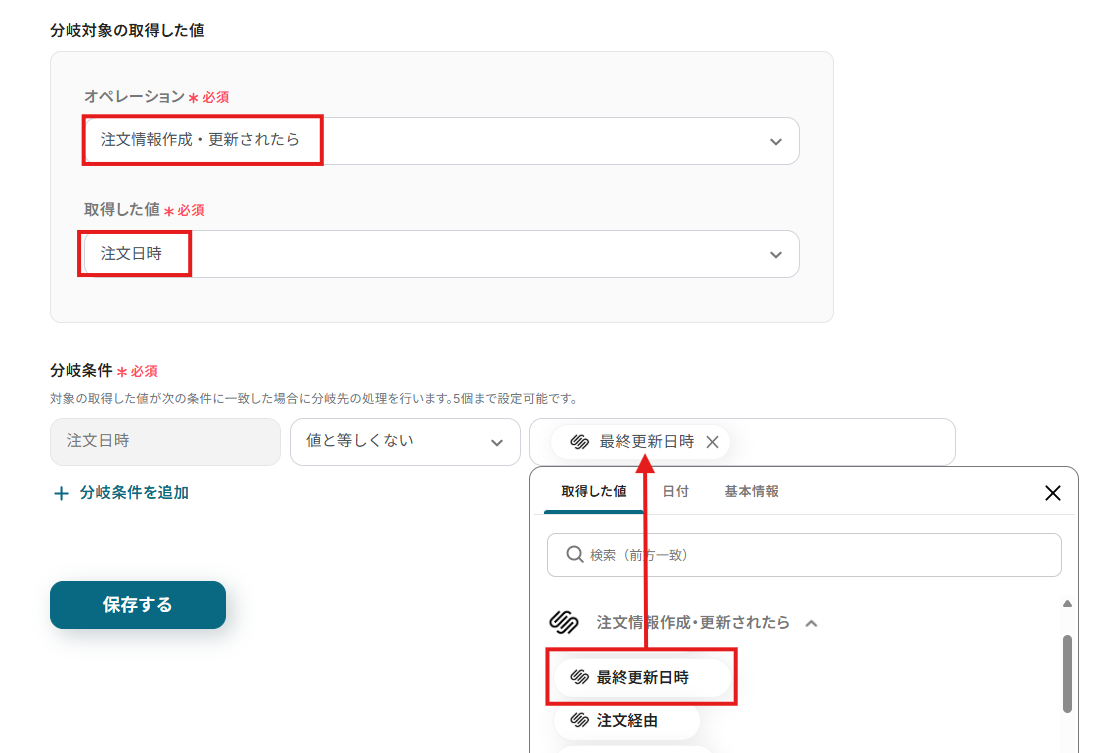 オペレーションに「注文情報作成・更新されたら」、取得した値に検知したい項目を設定します。