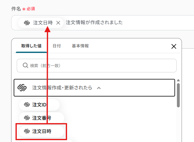 「件名」は、任意の件名を設定してください。入力欄をクリックして表示される取得した値や日付から選択することもできます。