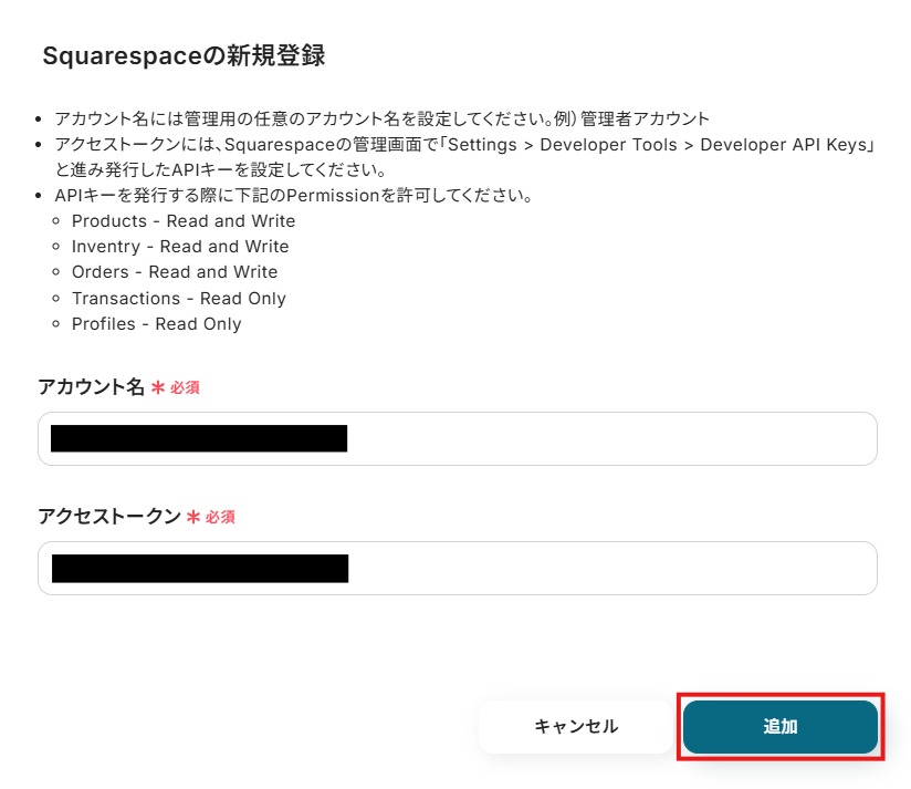 ※後続のSquarespaceのトリガー設定時のテストで必要になります。