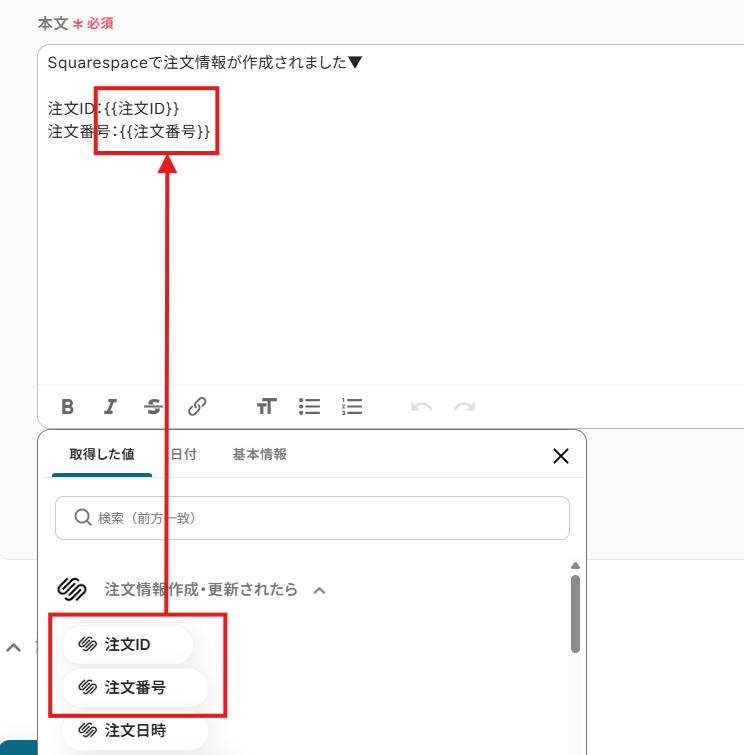「本文」は、入力欄をクリックして表示される取得した値から選択してください。