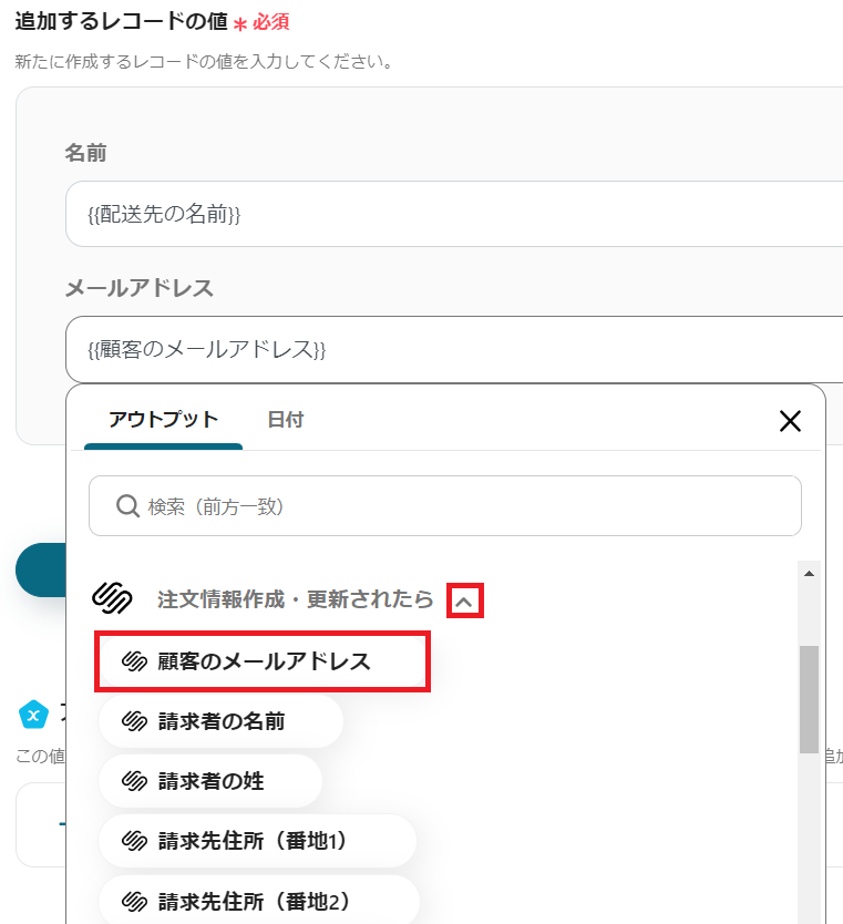 以下の画面が表示されるので、Squarespaceのアウトプットを使用して「追加するレコードの値」を設定してください。