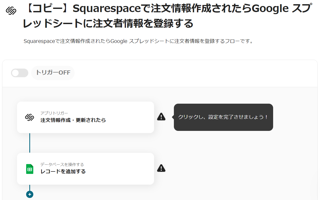 1.Squarespaceで注文情報が作成・更新されたら、Google スプレッドシートに情報を自動追加するフローです。
