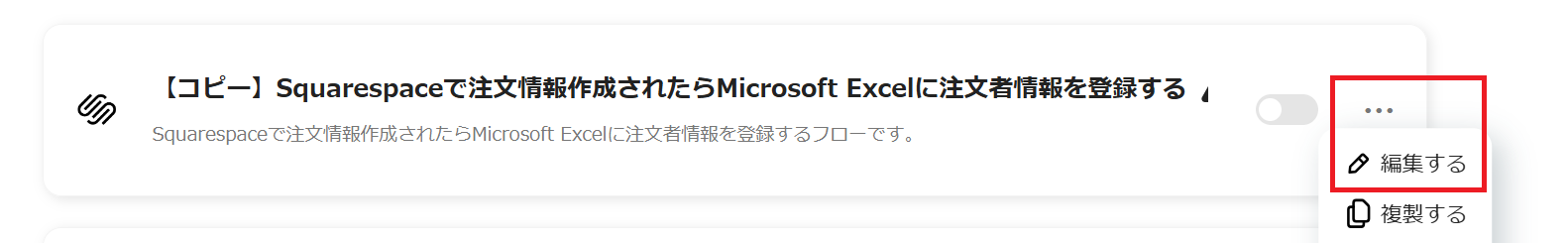 マイアプリ登録が完了したら、「Squarespaceで注文情報作成されたらMicrosoft Excelに注文者情報を登録する」フローボットを作成していきます。