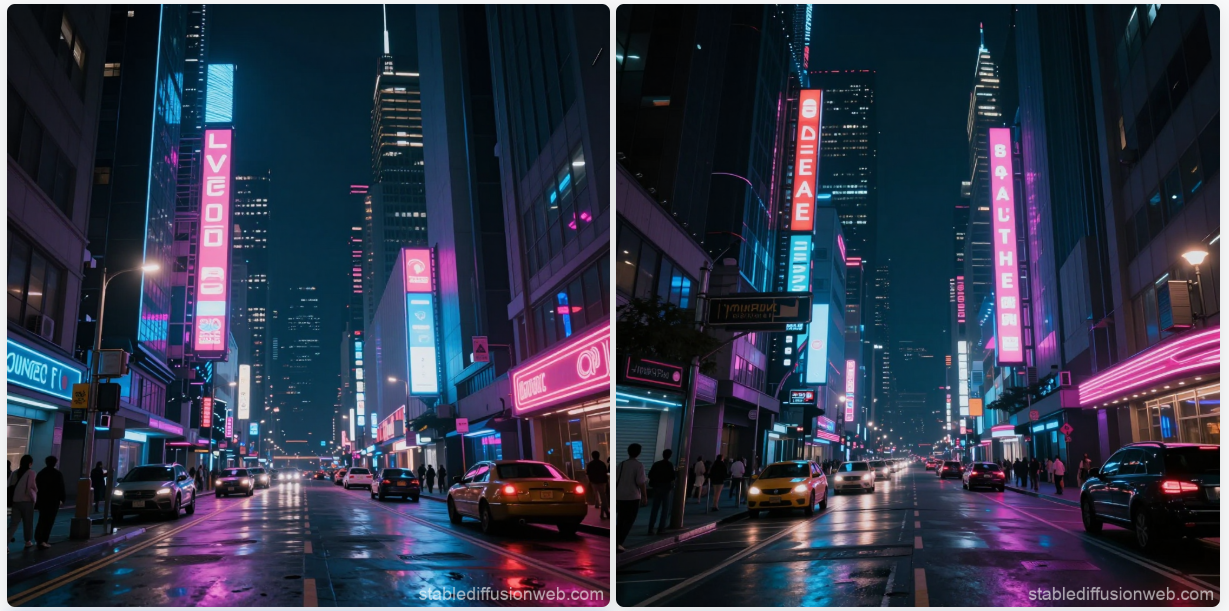 サイバーパンク特有の「ネオンの光が濡れた路面に反射する様子」や「緻密な建物の奥行き」が非常に高い解像度で描写されています。