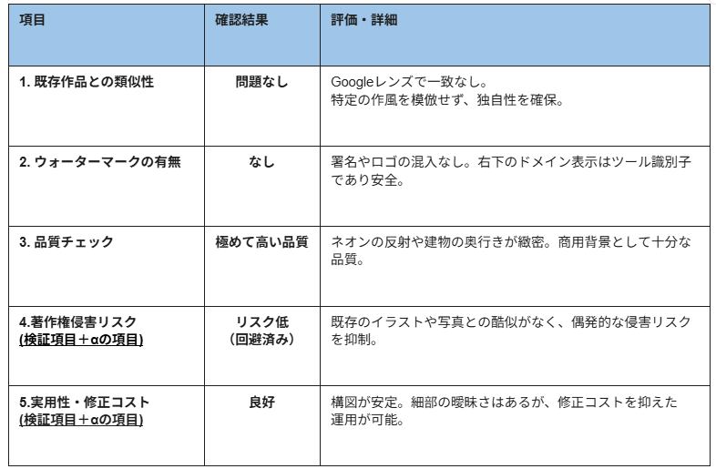 本検証を通じて、適切なモデル選定と抽象的な指示文を用いることで、法的リスクを最小化しつつ高品質なビジュアルを確保できる運用の妥当性が確認できました。