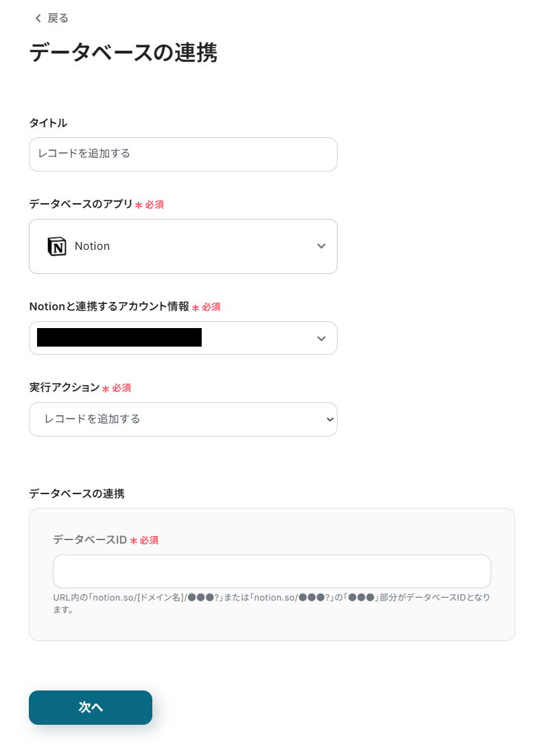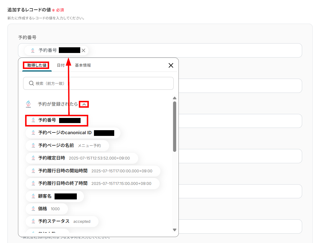 続く画面では、追加するレコードの値に、連携したデータベースの項目が表示されます。