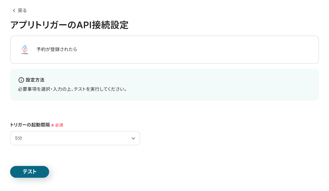 トリガーの起動間隔を設定し、STORES予約でテスト用に予約をします。