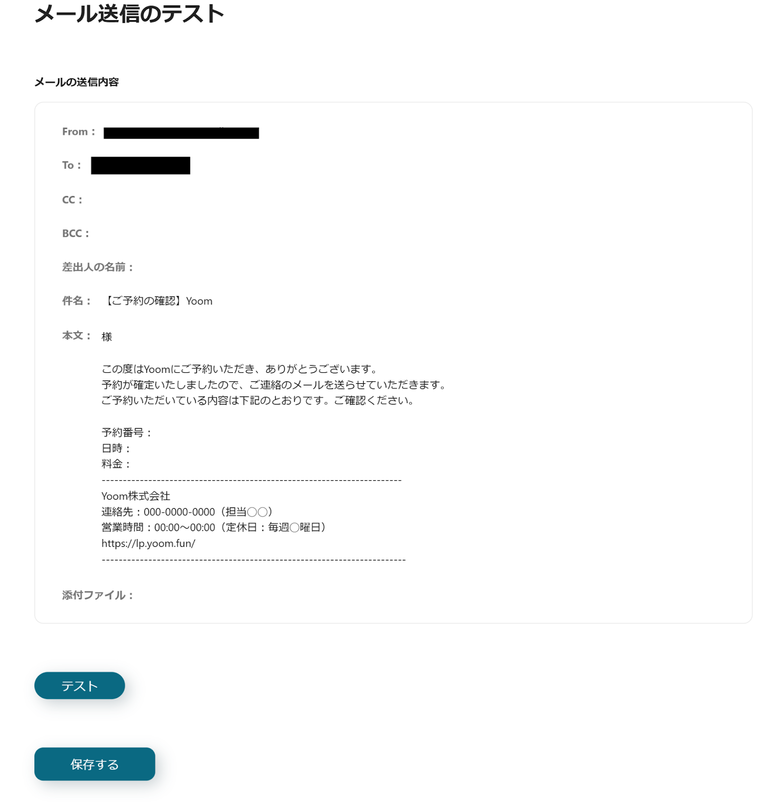以下のように確認画面が表示されるので、間違いがないか確認し、「テスト」→「テスト成功」→「保存」をクリックしてください。