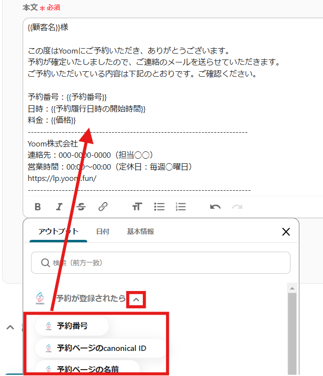 STORES予約のアウトプットを使用することで、簡単に予約情報を送信できます。