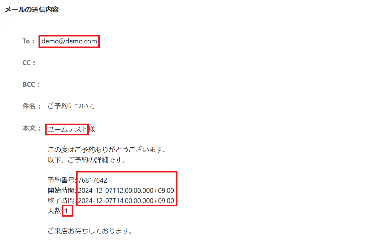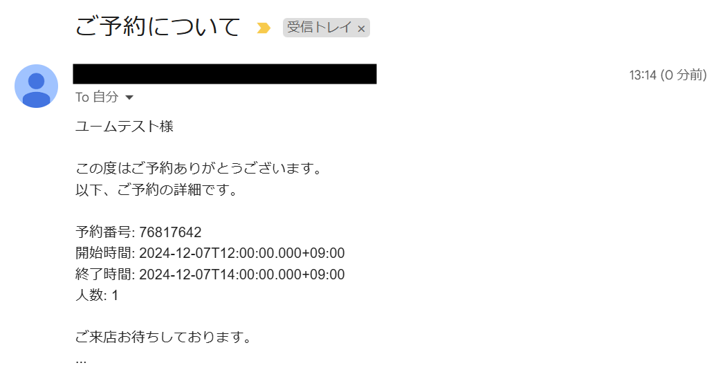この際、メールには「予約日」「予約時間」「人数」といった詳細が記載され、顧客はそれを再確認できます。