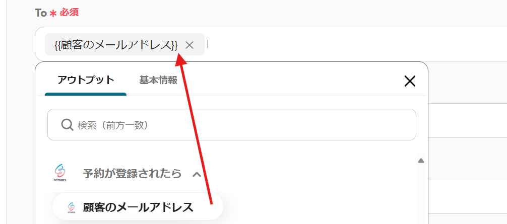 メールアドレスは以下のようにアウトプットから選択しましょう。