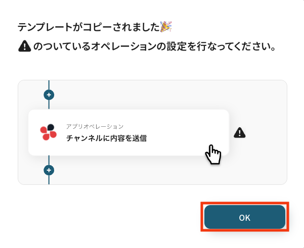テンプレートがコピーされると、以下のような画面が表示されますので、「OK」をクリックして設定を進めましょう。