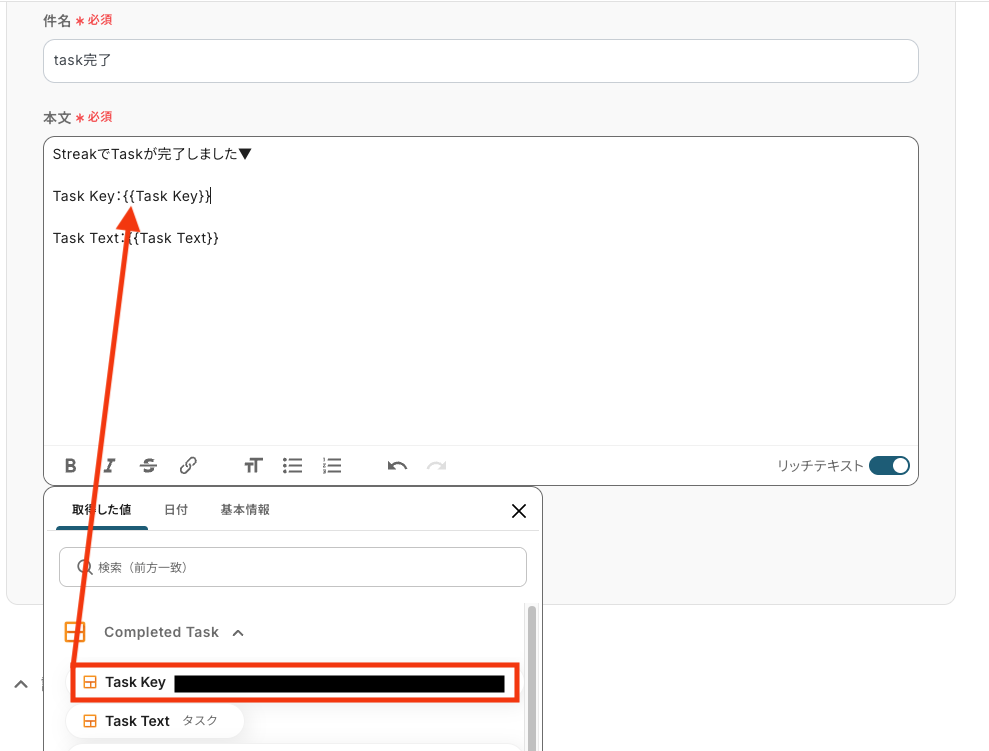 本文:入力欄をクリックすることで、前のステップで取得したアウトプットを挿入可能です。