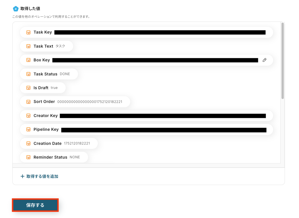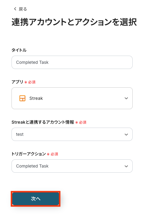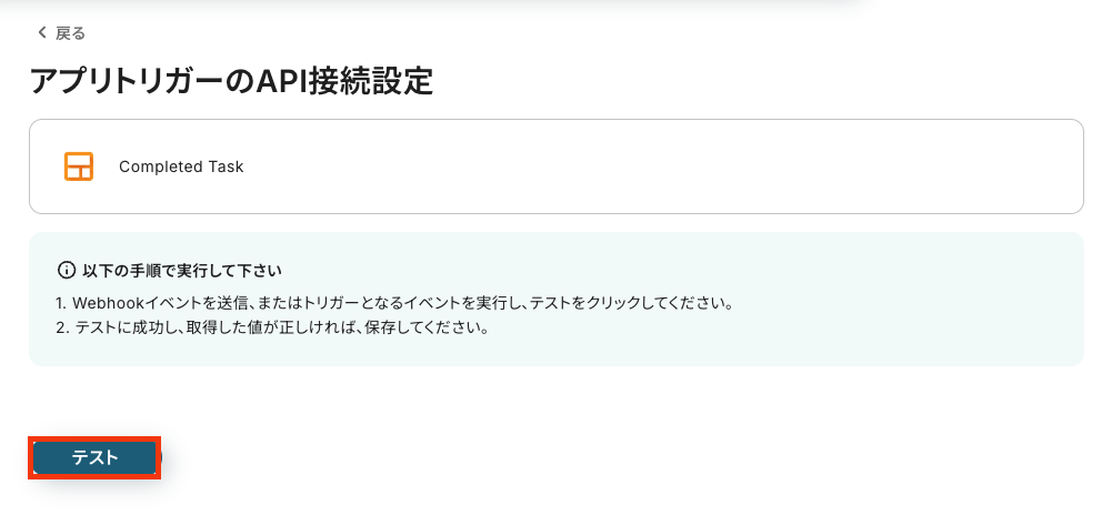 Streakから完了済みのタスク情報を正しく取得できるか確認するため、「テスト」をクリックします。