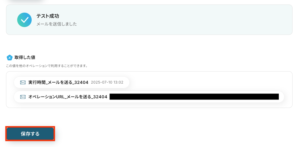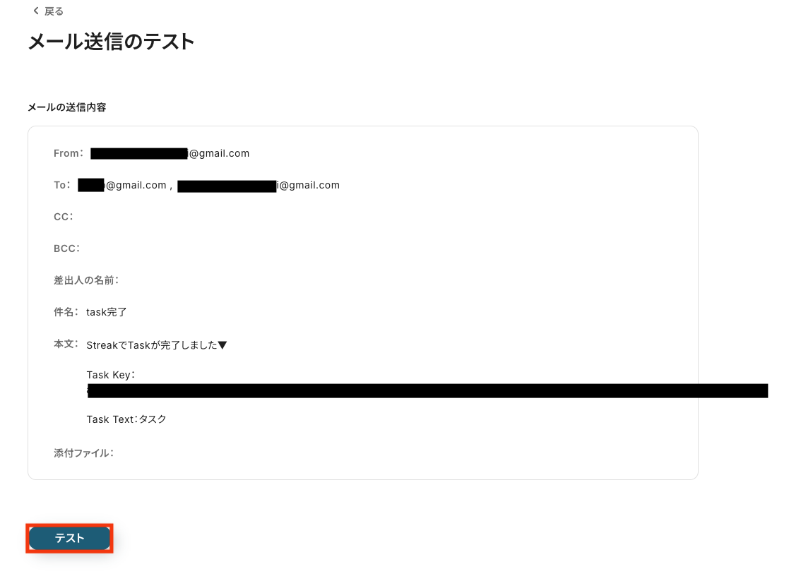 送信先・件名・本文などが正しく反映されているか確認し、「テスト」をクリックして実際にメールが届くかを確認しましょう。