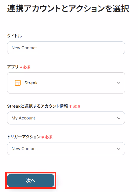 トリガーアクションが「New Contact」になっていることを確認して「次へ」をクリックします。