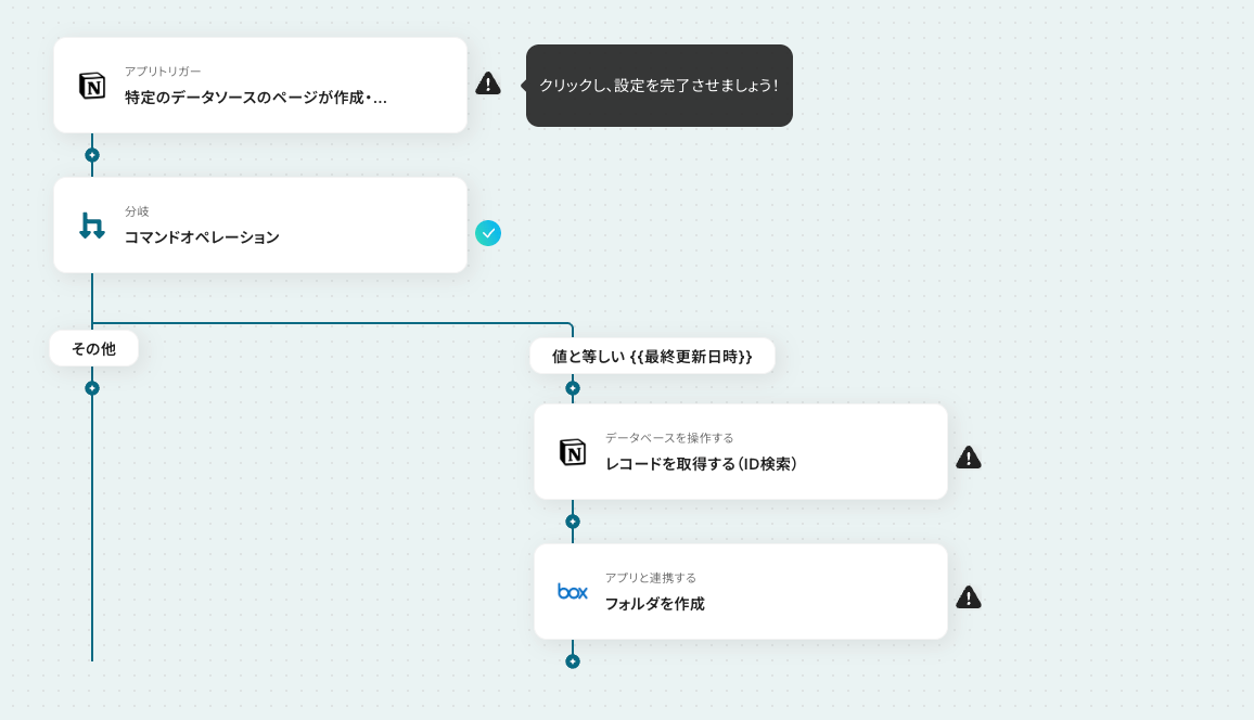 以上で、「Notionにページが作成または更新されたら、Boxにフォルダを作成する方法」フローの完成となります。