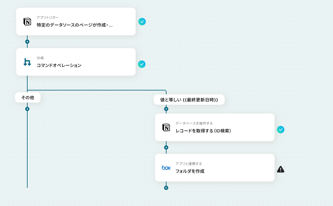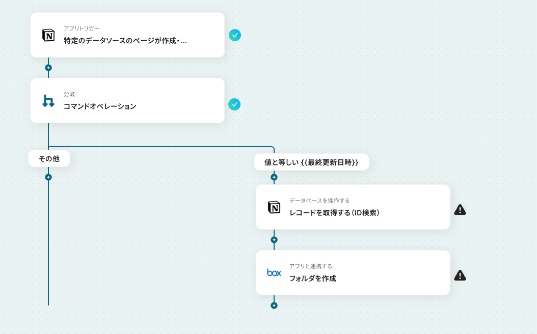 Notionのトリガー設定では、連携の対象としたいデータベースのIDを任意で設定してください。 特定の条件に応じて処理を分けたい場合は、分岐オペレーションを追加し、条件を自由にカスタマイズすることが可能です。 Boxでフォルダを作成するオペレーションでは、フォルダ名や保存先の親フォルダを、前段のNotionから取得した値を用いて自由に設定できます。 ■注意事項