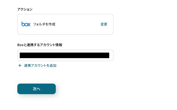 タイトルと連携するアカウント情報を任意で設定し、アクションはテンプレート通りに「フォルダを作成」のまま「次へ」をクリックして進んでください。