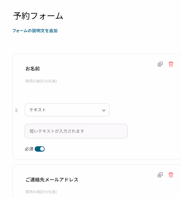 ・各質問項目:予約フォーム用に、名前や連絡先、希望日程や時間等を質問項目に設定します。