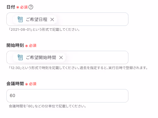 ・開始時刻:フォームで取得した時間の値を埋め込みます。