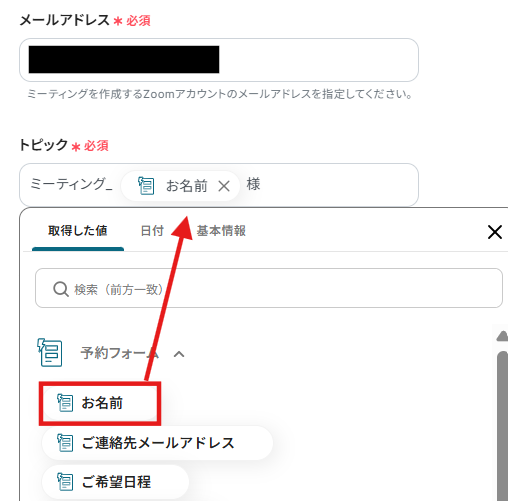 4.Zoomの「ミーティングを作成」というオペレーションでミーティングの設定を行ってください。
