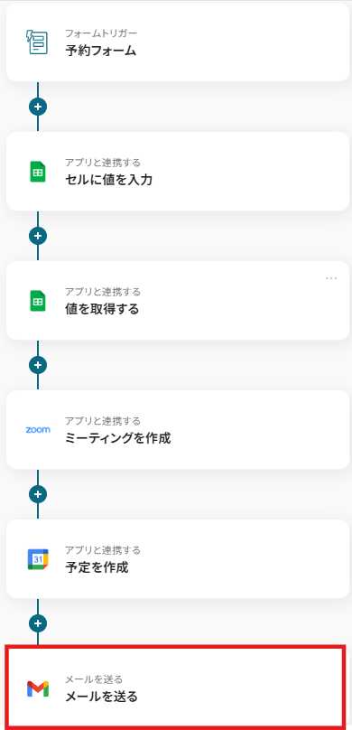 Yoomのフォームに回答が行われたら、Zoomのミーティングを発行し、Googleカレンダーへの予定追加とメール案内を行うフローです。
