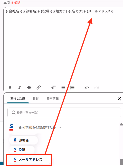 4.「本文」は、任意の内容とアウトプットを組み合わせることが可能です。