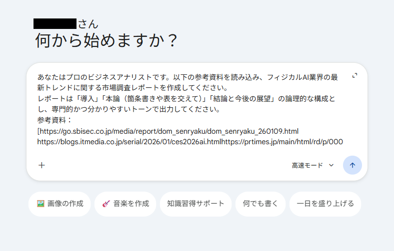本検証では、Gemini 3 Flashを使用して、レポートを作成します。