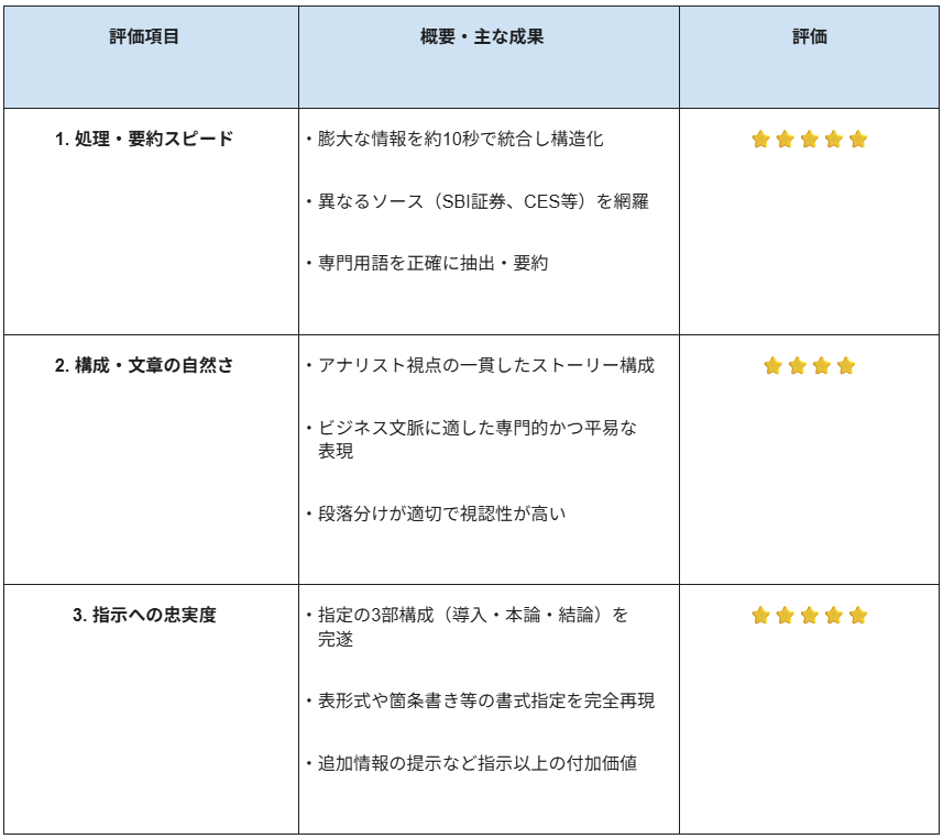 本検証の目的は、Geminiが大量のインプット情報と複雑な構造指定を同時に受け取った際、ビジネス実務における「即戦力」としてどこまで通用するかを明らかにすることです。 単なる情報の要約にとどまらず、プロのアナリストに求められる高度な論理性や専門的なトーンを維持しつつ、人間が数時間を要するリサーチと構成案の作成を数分単位に短縮できるかを確認します。さらに、指定された出力形式への忠実度を精査することで、最終成果物に至るまでの手直し(修正コスト)を最小限に抑えられるかを評価し、AIを業務フローの核として組み込むための客観的な判断材料を得ることを目指します。