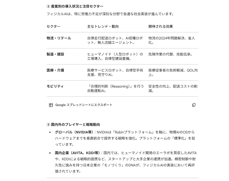 - 形式の遵守: 本論における「セクター別の導入状況」をスプレッドシートへのエクスポートも可能な「表形式」で出力しており、比較分析が容易になっています。