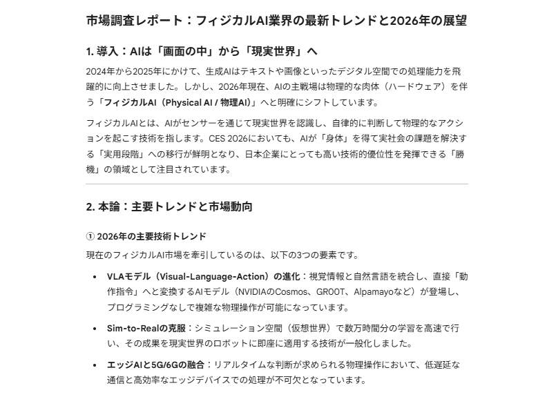 あなたはプロのビジネスアナリストです。以下の参考資料を読み込み、フィジカルAI業界の最新トレンドに関する市場調査レポートを作成してください。