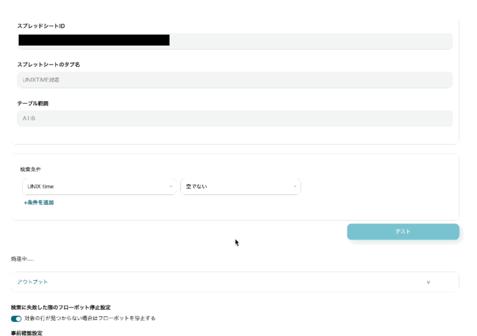 17.検索条件を「UNIXTIMEが空でない」として、テストが成功したら、「保存」します。