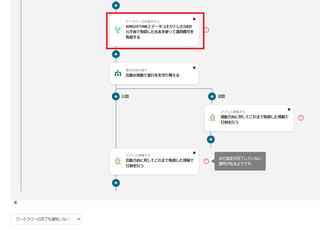24.フローに戻ったら「データベースを操作する KING OF TIMEとデータコネクトしたDBから手前で取得した氏名を使って識別番号を取得する」のアイコンをクリックします。