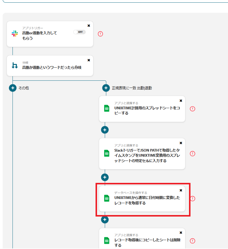 Slackで特定のワードを入力したらそれを使ってKING OF TIMEに打刻します。 ■使用しているスプレッドシート ・https://docs.google.com/spreadsheets/d/11SWeZXQ8ydRUvjJ4va176dJVLCikBkwCoxb3LssCbng/edit#gid=905845917 ■留意点 ・SlackとKING OF TIMEのデータコネクトの際に、Slack側の氏名とKING OF TIMEの姓名情報が一致している必要があります。 ・出勤と退勤のみの設定を想定していますが、休憩等ある場合は分岐や進行先の切り替え設定を変えることで対応できます。 ■作成手順 ①Slackトリガーで「新しいメッセージがチャンネルに投稿されたら」を設定し、投稿を行う任意のチャンネルを設定し一度デモ投稿して、テストします。その後レスポンス結果にあるts横の+マークを押してアウトプットにタイムスタンプを取得します。 ②分岐を設け、①のオペレーションとアウトプットに「メッセージ内容」を設定し、条件は正規表現に一致する、値は「出勤|退勤」のように設定します。 ③スプレッドシートを別で用意し、以下のURLまたは添付したスプレッドシート上にヘッダーと関数を設定します。 ※UNIXTIMEを通常の日付・時刻に変換する方法:https://intercom.help/yoom/ja/articles/8343335 ※この際A2セルは書式なしテキストに、日付のセルはYYYY-MM-DD形式に書式を事前に変更してください。 ④アプリと連携するでスプレッドシートのシート(タブ)をコピーするアクションを選択し、③で用意したスプレッドシートのタブをコピーする設定をします。 ⑤アプリと連携するでスプレッドシートのセルに値を入力するアクションを選択し、④でコピーしたスプレッドシートのA2セルに①で取得したtsというアウトプットを埋め込みます。 ※シート名は④でコピーしたアクションのアウトプットから埋め込みます。 ⑥データベースを操作するでスプレッドシートのレコード取得を選択し、③で用意したスプレッドシートでA1:Bと範囲設定し、UNIXTIMEが空でないで検索をかけ、レコードを取得します。 ※※シート名は④でコピーしたアクションのアウトプットから埋め込みます。 ⑦アプリと連携するでスプレッドシートのシート(タブ)を削除するアクションを選択し、④でコピーしたタブを削除する設定を行います。 ※シートIDは④でコピーしたアクションのアウトプットから埋め込みます。 ⑧Yoomデータベースで事前にテーブルを2つ用意し、データコネクトでSlackとKING OF TIMEを同期させます。 ※SlackはユーザーIDと表示名や氏名を表示項目とします。 ※KING OF TIMEは姓、名、識別番号を表示名とします。 ⑨KING OF TIMEをデータコネクトしたテーブルに1列関数の列を設け、「JOIN("",{姓},{名})」このように設定し姓名を連結させます。 ⑩データベースを操作するでYoomを選択し、Slackのデータコネクトを行ったテーブルでレコード取得を行い、ユーザーIDが①で取得した{{送信者}}に等しいと設定します。 ⑪データベースを操作するでYoomを選択し、KING OF TIMEのデータコネクトを行ったテーブルでレコード取得を行い、関数で連結した氏名が⑩で取得した{{氏名}}や{{表示名}}に等しいと設定します。 ⑫進行先の切り替えで、オペレーションは①、アウトプットはメッセージ内容とし、出勤と退勤を直接進行先に入力します。 ⑬進行先それぞれに対してアプリと連携するからKING OF TIMEの打刻データを登録を設定し、識別番号や打刻時間などを⑥や⑪で取得した値を埋め込み設定します。