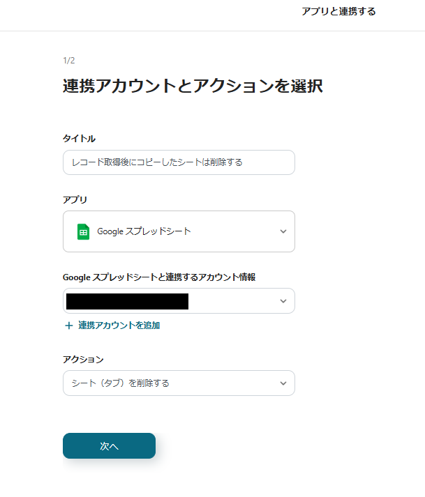 16.データベースの連携の項目を入力します。 スプレッドシートIDは1つ前に連携したスプレッドシートと同じです。 入力できたら、「次へ」をクリックします。