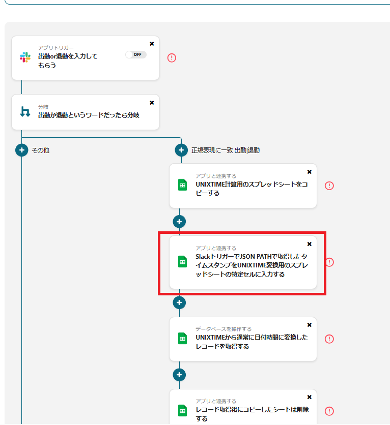 11.フローに戻ったら「アプリと連携する SlackトリガーでJSON PATHで取得したタイムスタンプをUNIXTIME変換用のスプレッドシートの特定セルに入力する」のアイコンをクリックします。