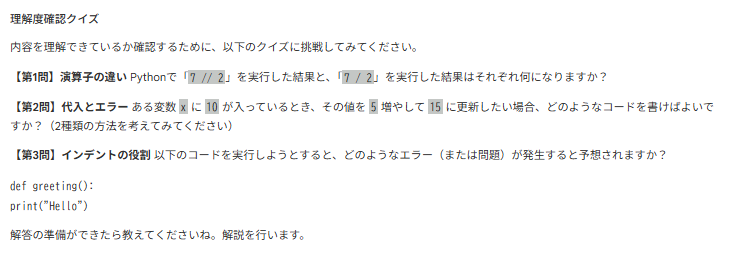 生成されたクイズは、事前に抽出された5つの重要ポイントと密接に連動しており、インプットした知識をすぐにアウトプットできる高い整合性を持っています。第1問の「演算子の違い(//と/)」はポイント1のデータ型に基づき、第2問の「代入による更新」はポイント2に、第3問の「インデントのエラー予想」はポイント3にそれぞれ対応しており、学習の抜け漏れを効率的にチェックできる設計です。