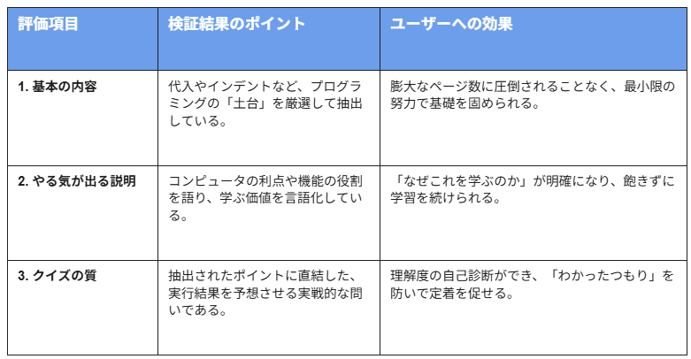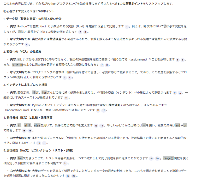 NotebookLMは、500ページ超の膨大な情報から、初心者が最初の一歩で躓きやすい要素を過不足なく抽出しています。抽出された5つのポイント(データ型、代入、インデント、条件分岐、反復処理)は、プログラミングの「読み書き」における基礎中の基礎であり、学習の土台として適切な選択です。特に、数学の「=(等号)」とプログラミングの「代入」の違いを明確に区別し、「右辺の評価結果を左辺の変数に割り当てること」と平易に解説している点は、初心者が抱きやすい混乱を先回りして解消しています。