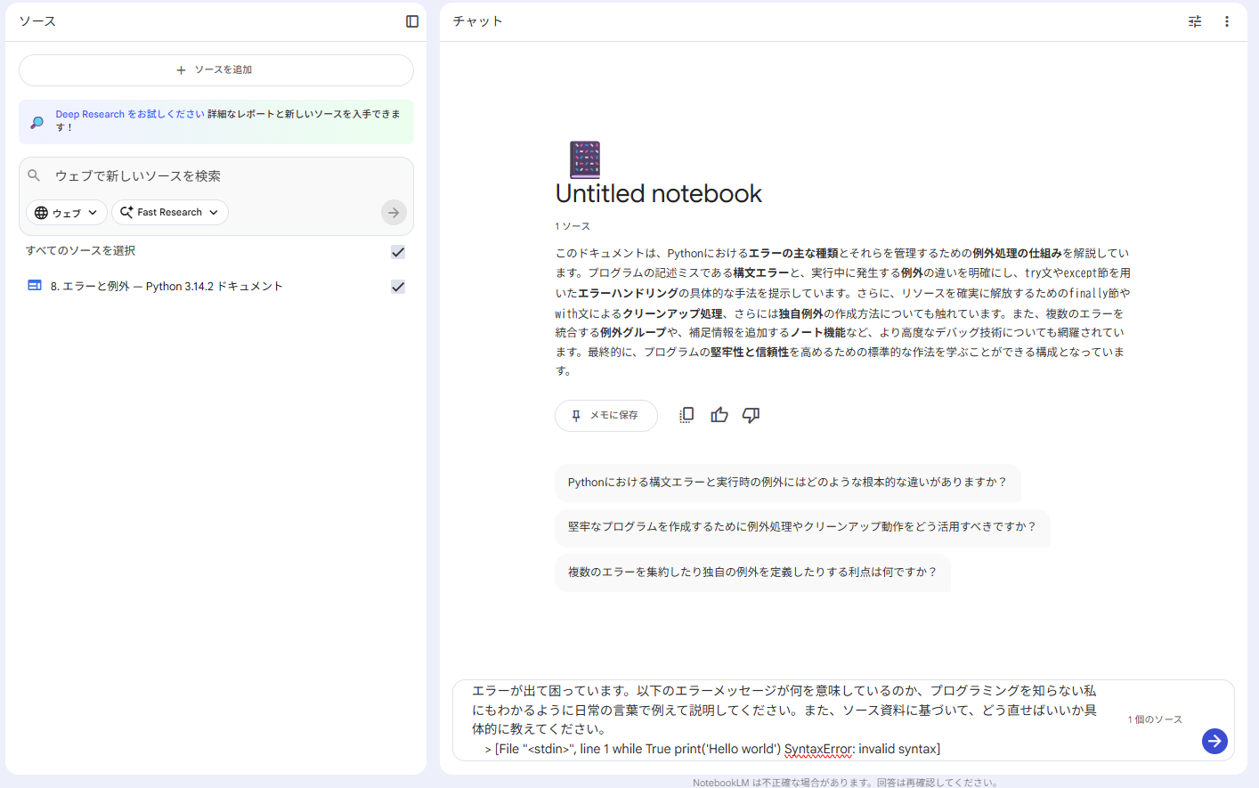 プログラミング未経験者が最も挫折しやすい「構文エラー」という壁に対し、NotebookLMはソース資料の定義を正確に引用しつつ、期待を上回る柔軟な解説を生成しました。