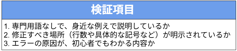 2. 修正すべき場所(行数や具体的な記号など)が明示されているか