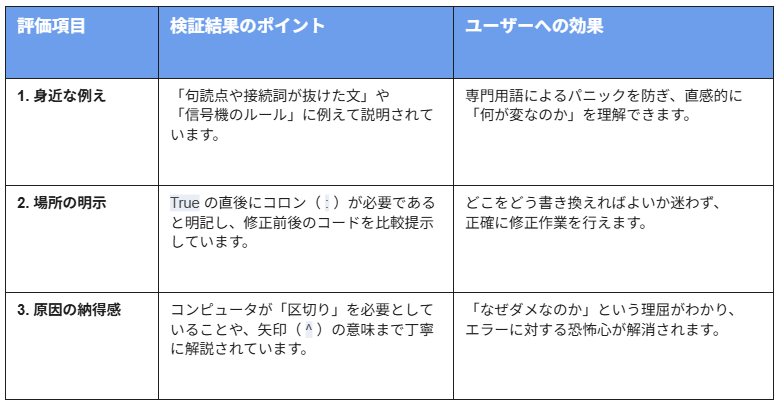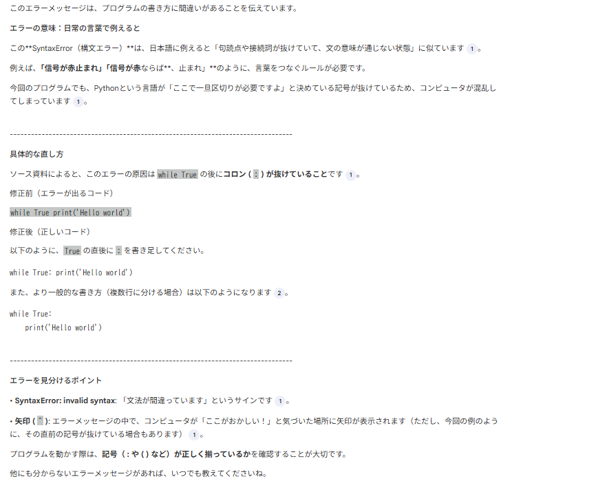エラーの原因が「コロン(:)」の欠如であることをソースに基づいてすぐに特定し、修正前後のコードを対比させて提示できる正確性は、学習者の心理的なハードルを下げてくれるでしょう。