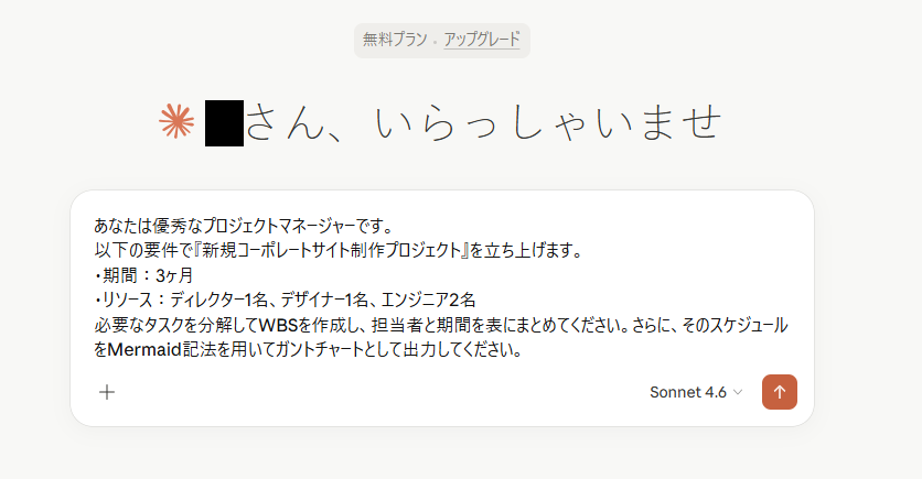 今回は、「新規Webサイト制作プロジェクト」という架空の要件を基に、Claudeにタスクの洗い出しからスケジュールの作成、そしてガントチャートによる視覚化までを一貫して行わせます。