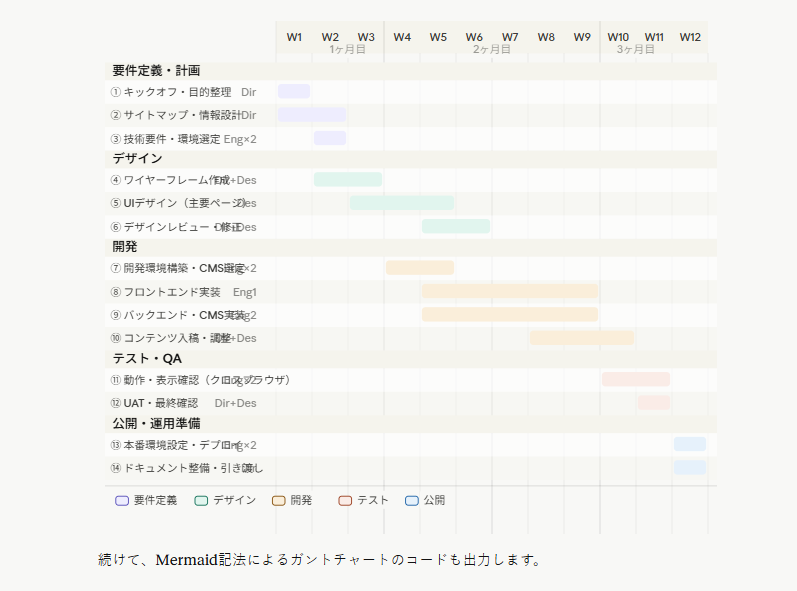 2. スケジュールを視覚化するため、Mermaid記法でガントチャートのコードも出力すること。