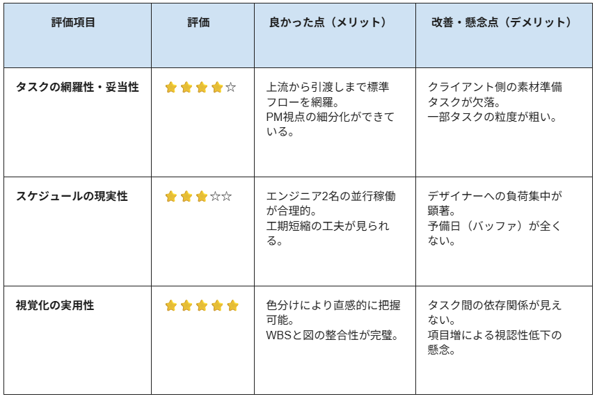 - バッファの欠如: 3ヶ月(12週)をフルに使い切っており、不測の事態や大規模な修正に対する「予備日」が含まれていない点は、実運用上のリスクと言えます。
