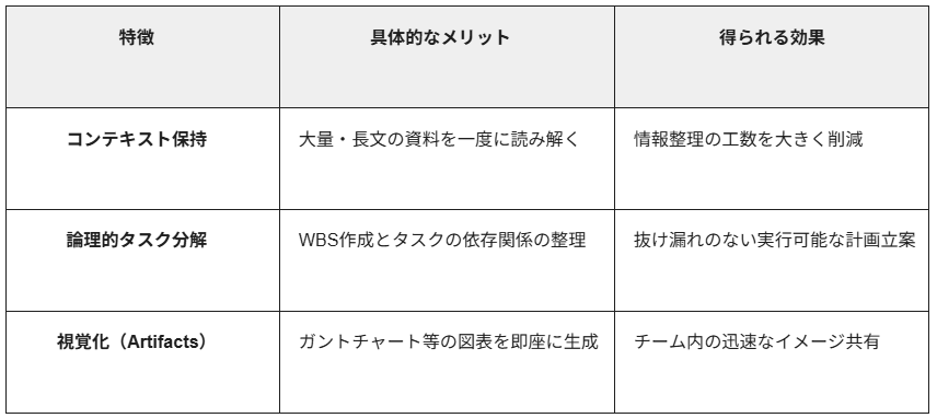 - 膨大な資料の文脈理解:数十ページの要件定義書や議事録を読み込み、背景や制約を考慮した高精度な計画を即座に提示できる。