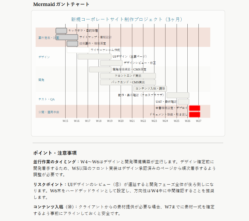 - Mermaidの正確性: 構文エラーがなく、WBS表の期間(W1〜W12)とガントチャートの時間軸が完全に一致しています。これにより、手動で図を作成する工数を大きく効率化できるポテンシャルを感じさせます。